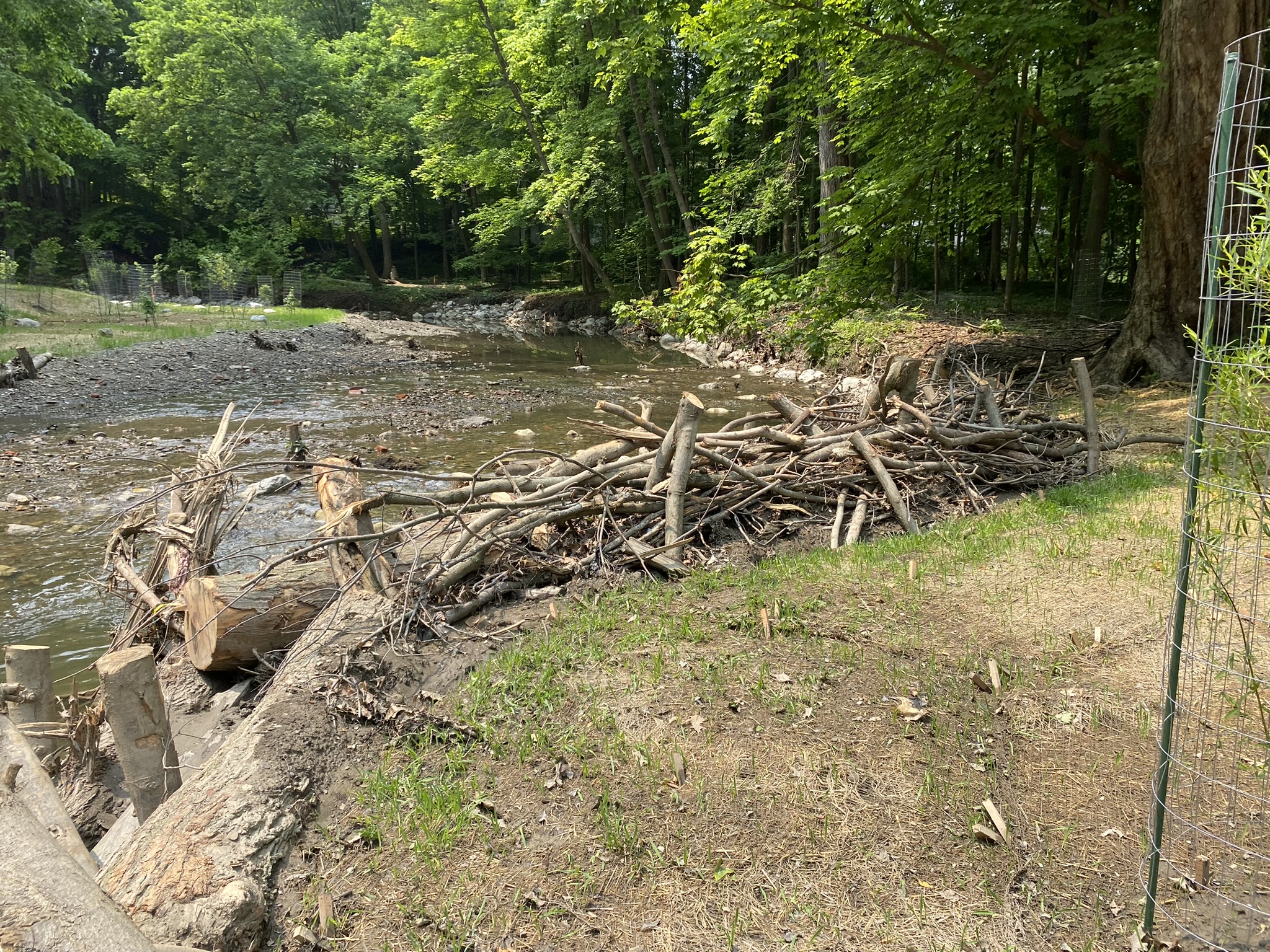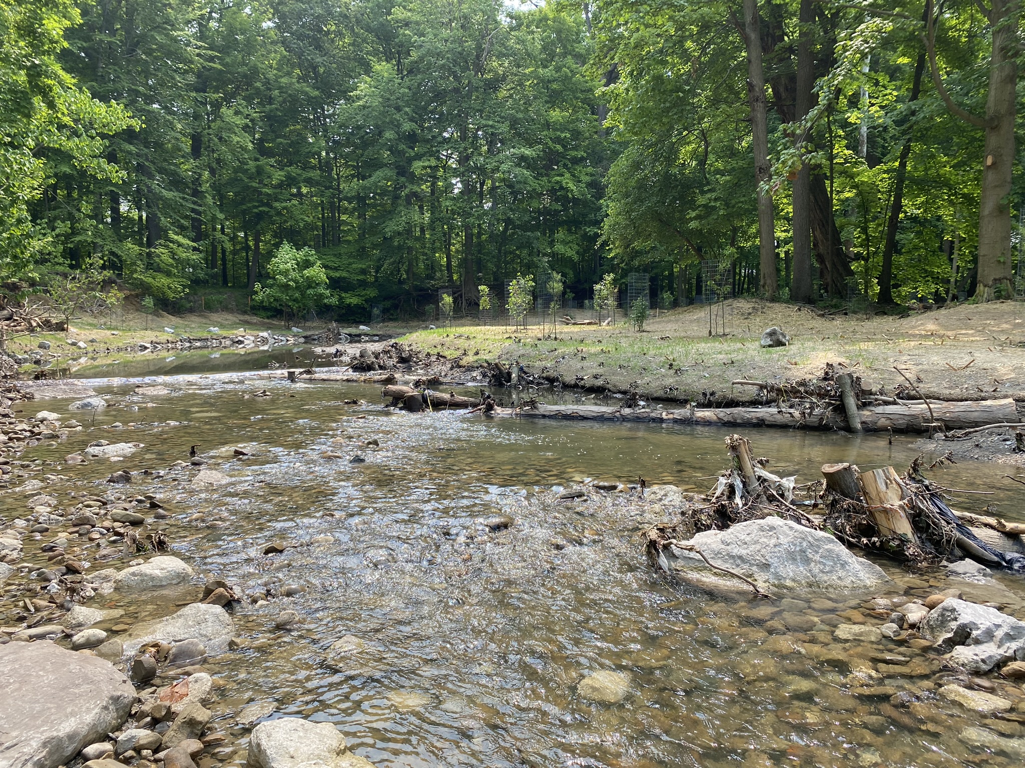 Using nature-based approaches, EnviroScience and RiverReach restored 2,200 linear feet of stream and made use of boulders, woody debris, branches, and log revetments to add stability to the streambanks and create additional habitat within the stream channel. The project also enhanced about 3.2 acres of riparian area with invasive species removal and native species plantings. This project will mitigate the impacts of urban stormwater at this site by improving floodplain access and reducing pollutants from stormwater flows. By reducing urban stormwater pollution, the water quality will improve and provide better conditions for fish and wildlife. Floodplains are also vital for stream stability as they reduce the volume and energy in the channel by providing overbank storage of flow and help to prevent future erosion on the streambanks.